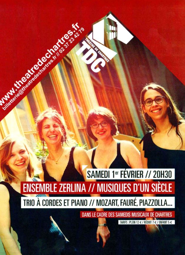 Ce samedi 1er février, le jeune Ensemble Zerlina a séduit le public venu très nombreux au théâtre de Chartres. Très souriantes, les quatre musiciennes ont proposé un programme magnifique et original, très équilibré, où Mozart côtoyait la musique hongroise de Maratka, et Fauré les tangos de Piazzolla. Leur profonde musicalité servie par une technique éblouissante, leur évidente complicité, leur générosité ont fait de cette soirée un moment magique qui a enchanté les spectateurs.
