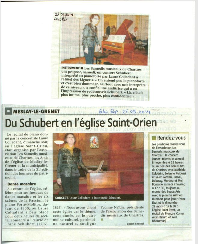 Samedi 20 septembre, le Grand Salon de l’Hôtel des Ligneris, lieu chargé d’histoire où Jean Moulin avait son bureau et où le Général De Gaulle s’est arrêté à son retour de Londres. Après une visite commentée des lieux et une explication par le préfet sur le rôle de sa fonction en notre république, Laure Colladant a su enchanter l’auditoire venu très nombreux avec un récital Schubert, suivi de trois bis : deux mazurkas et une nocturne de Chopin qui revêtaient toute leur poésie sur le piano-forte signé Philippo Molitor que Laure Colladant avait transporté jusque-là.