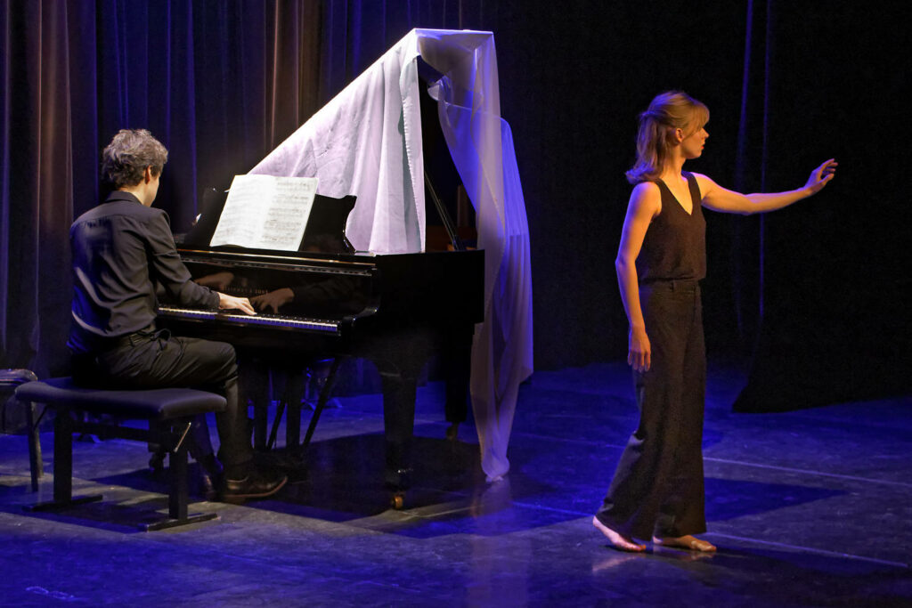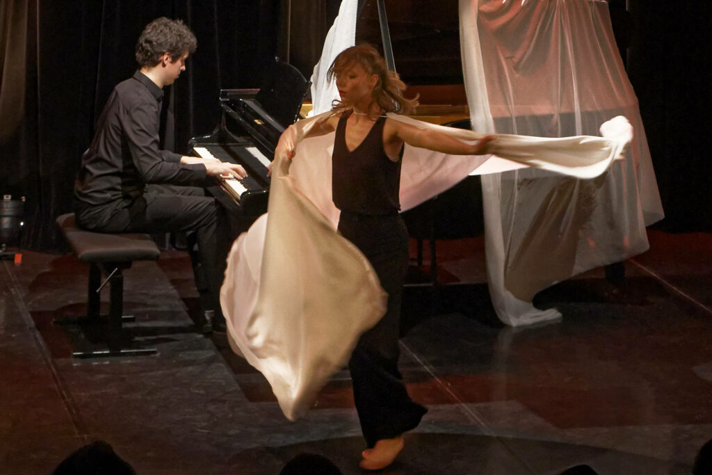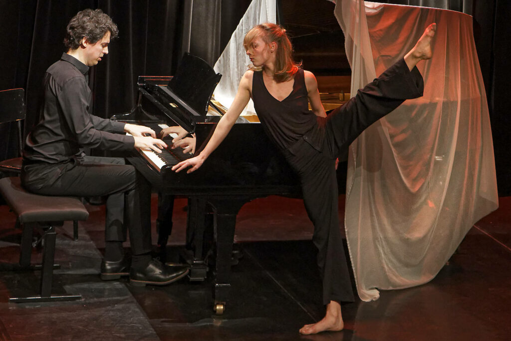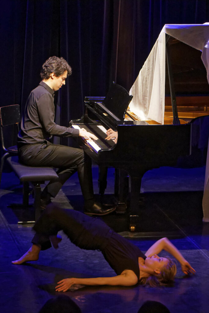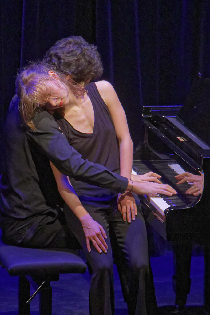 En première partie Clément Rataud a brillamment joué différentes études, valses et barcarolle de Chopin, une musique sur laquelle Océane Delbrel a magnifiquement dansé, en occupant la scène et en captivant son public. Elle incluait le pianiste dans ses mouvements, en le poussant, en grimpant sur ses genoux ou épaules etc.