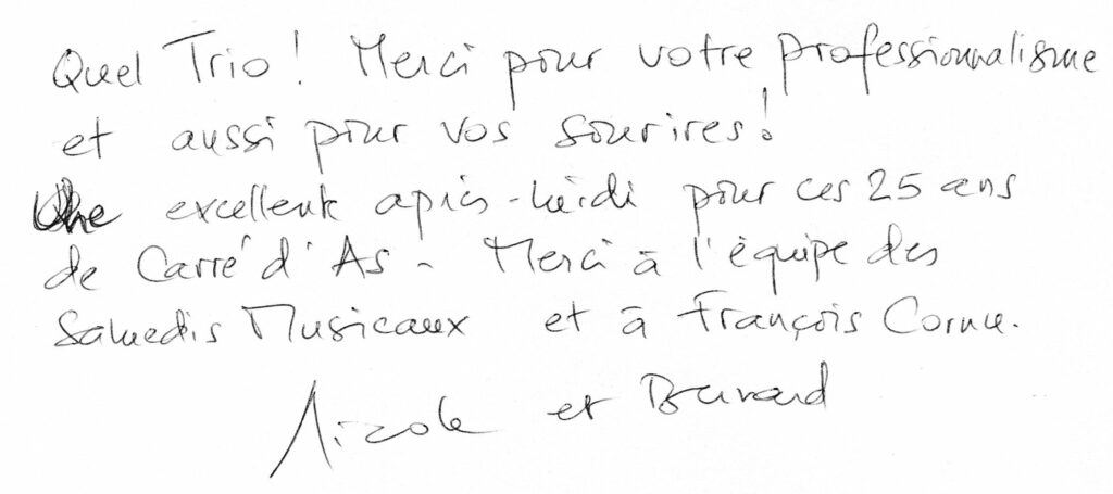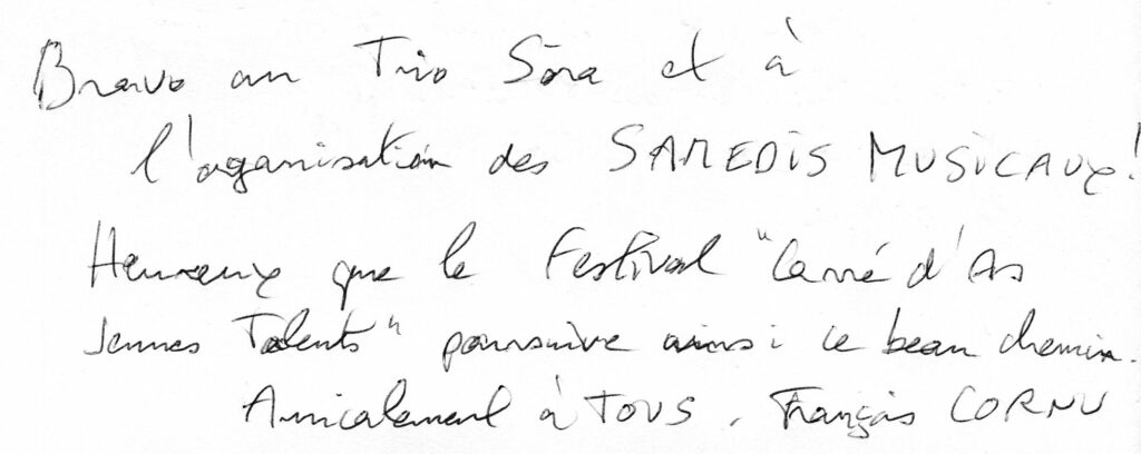 Un programme merveilleux, digne des plus grands et très cher à François Cornu qui sera heureux d’entendre la jeune génération en clôture de ce 25ème festival Carré d’As Jeunes Talents !