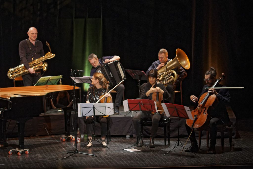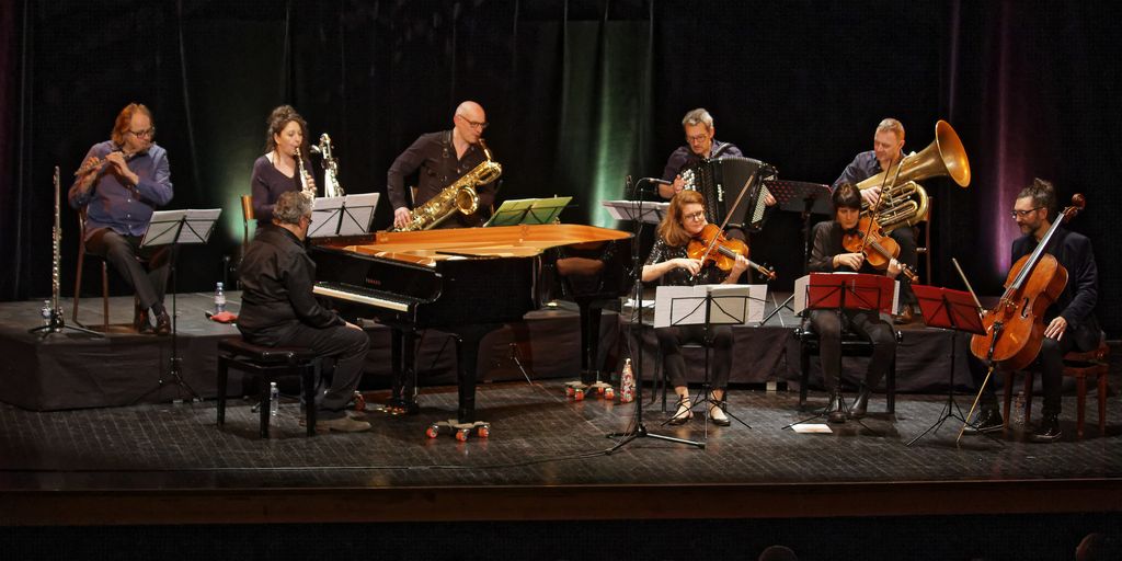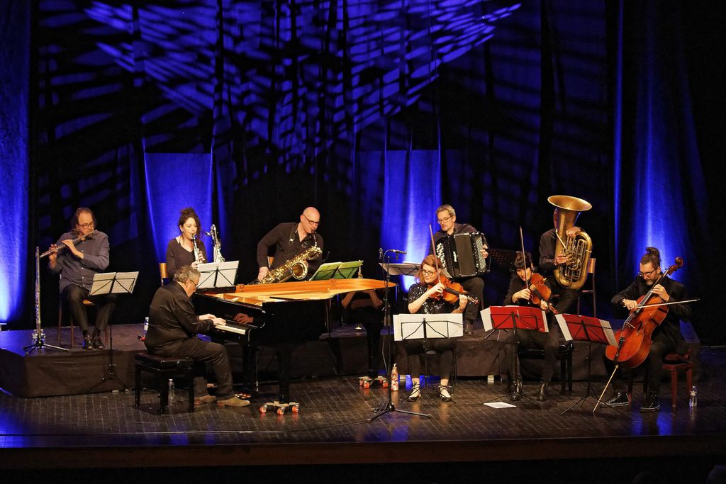 Vous entendrez un ensemble de 9 personnes, très original, que l’on pourrait appeler « jazz de chambre », avec un parti pris totalement acoustique. Le programme mêle une suite où chacun des instrumentistes est à son tour soliste. Il y aura piano, violon alto, violoncelle, accordéon, clarinette + clarinette basse, flûte + flûte alto, saxophone soprano + baryton, tuba…