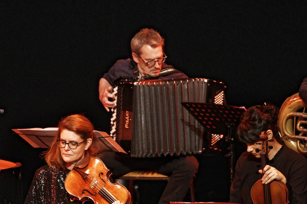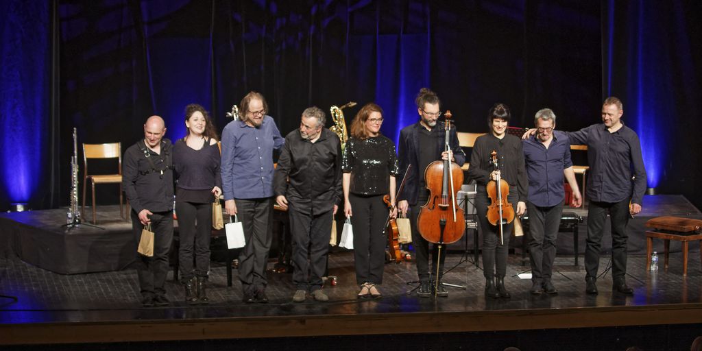 Flûtes, clarinettes, accordéon, saxophones, tuba, violons altos, violoncelle, tous sont réunis autour du piano, comme reliés les uns aux autres dans un grand corps harmonieux, par la grâce d’une musique qui dépasse les genres pour explorer d’autres univers sonores en laissant libre cours à l’imagination de chacun.