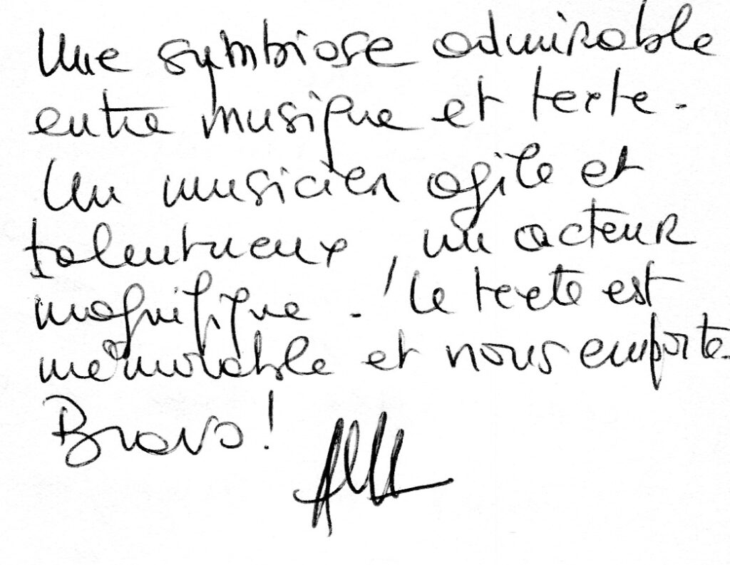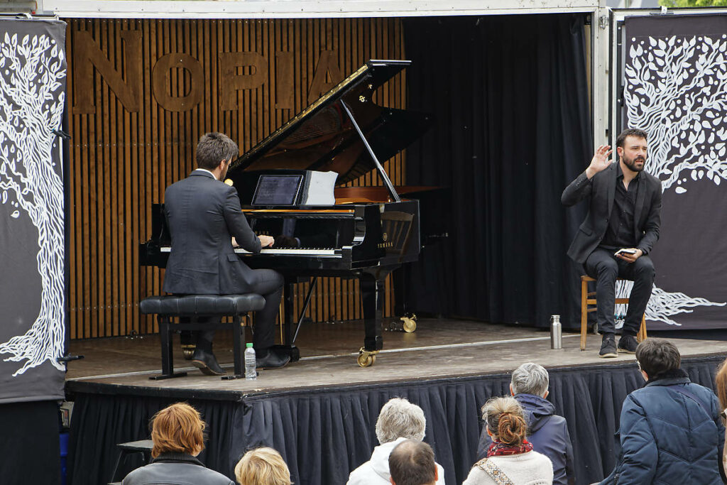 Avec François Michonneau, comédien, ils explorent ensemble, avec humour, les liens entre les textes et la musique… Ainsi le duo fait-il vivre aux spectateurs le questionnement nerveux du pianiste avant l’entrée en scène.