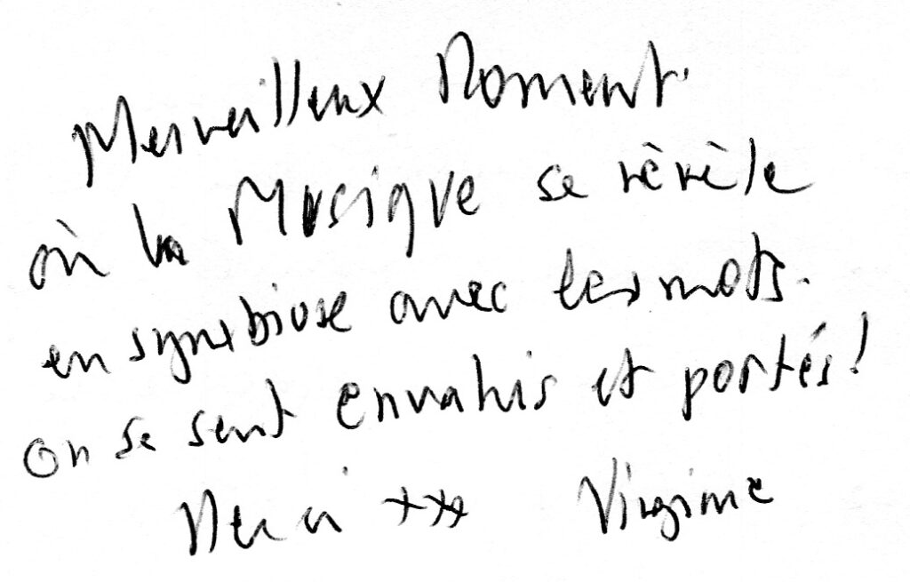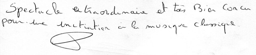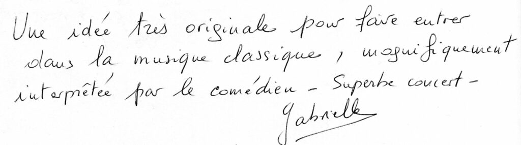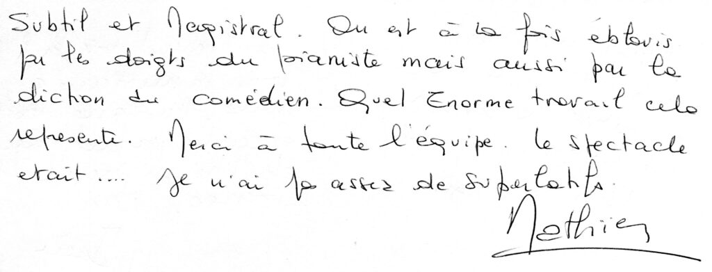 Explorant avec humour et poésie le pouvoir de la musique, le concert-spectacle « Elle » a profondément touché tous les spectateurs : emportés par le texte, le jeu et la sensibilité du comédien, ils ont été conquis par le toucher magnifique et la grande musicalité du pianiste.