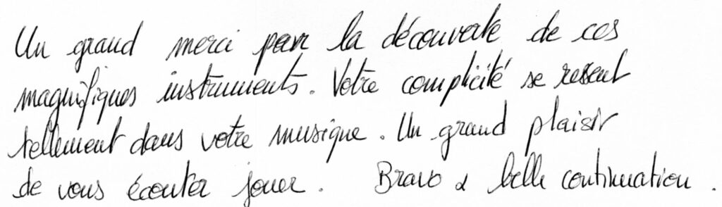 Avec leur grande virtuosité, les deux artistes ont permis à un public heureux de découvrir la sonorité particulière de ces deux beaux instruments, particulièrement adaptés au cadre de l’Orangerie du Château à Maintenon, le public faisant salle comble au Temple Protestant le lendemain.